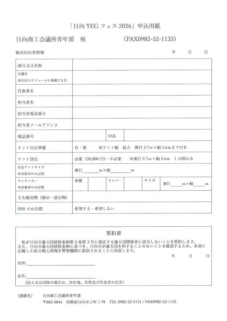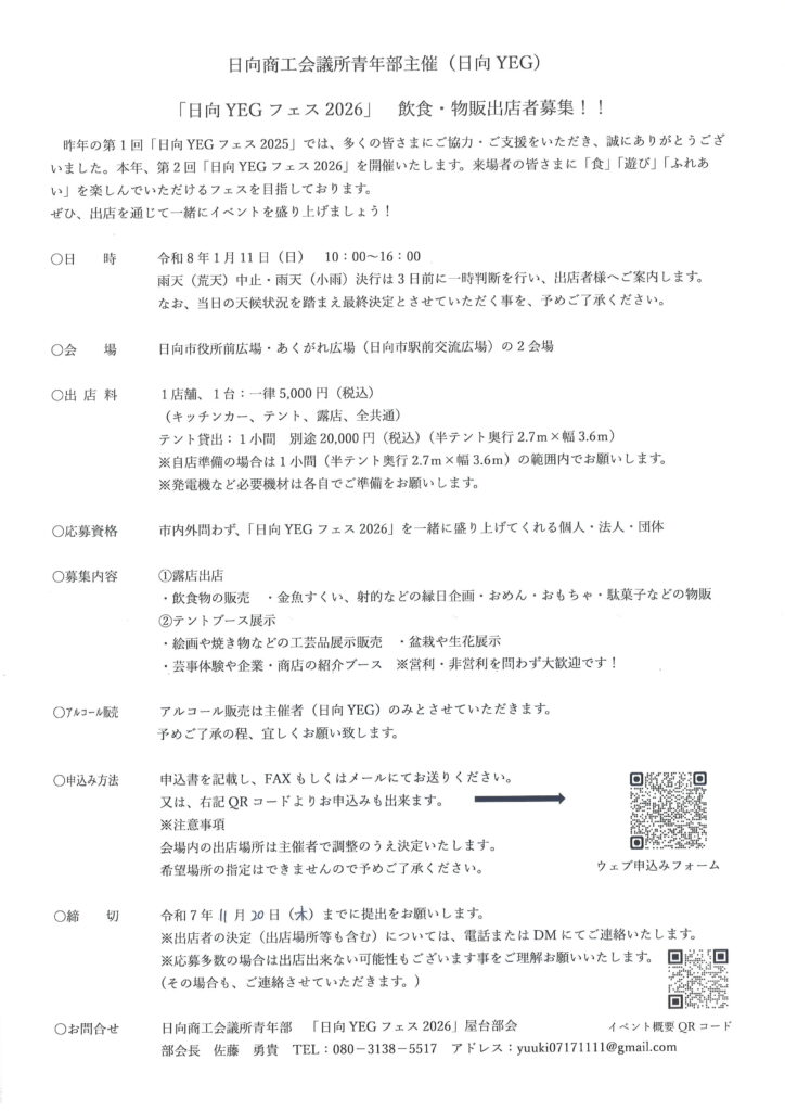 昨年大盛況だった「日向YEGフェス」を令和8年1月11日に開催いたします!来場者の皆さまに「食」「遊び」「ふれあい」を楽しんでいただけるフェスを目指しております。