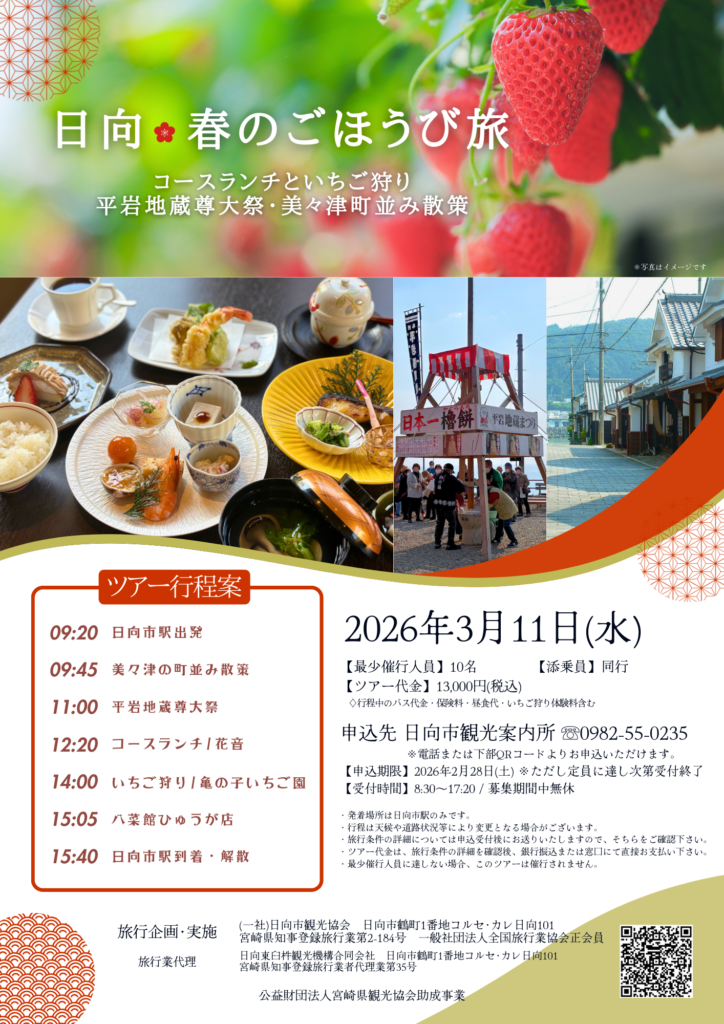 美々津の町並みや平岩地蔵尊大祭を訪れたあとは、コースランチと旬のいちご狩りをお楽しみいただきます。春の日向を一度に味わえる1日、ぜひお誘いあわせの上、ご参加ください!